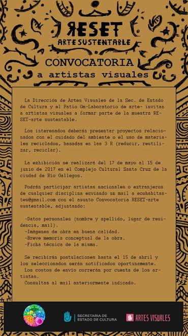 Rio Gallegos | Los interesados debern presentar proyectos relacionados con el cuidado del ambiente o el uso de materiales reciclados, basados en las 3 R (reducir, reutilizar, reciclar). La exhibicin se realizar del 17 de mayo al 15 de junio de 2017 en el Complejo Cultural Santa Cruz de nuestra ciudad capital y las postulaciones se recibirn hasta el 15 de abril y los seleccionados sern notificados oportunamente. Los costos de envo corrern por cuenta de los artistas.