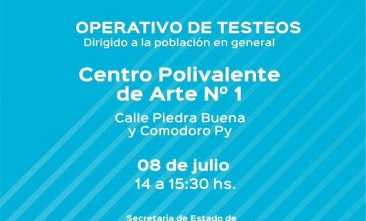 Rio Gallegos | El Gobierno de Santa Cruz, a travs de la Secretara de Dispositivos Territoriales, dependiente de Jefatura de Gabinete, lleva adelante los operativos de deteccin temprana de casos asintomticos. Con este fin, maana jueves 8 de julio de 14:00 a 15:30 se realizaran testeos en el Centro Polivalente de Arte, ubicado en la interseccin de las calles Comodoro Py y Piedrabuena.