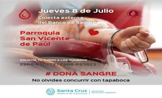 Rio Gallegos | El Centro Regional de Hemoterapia convoca a la comunidad de Ro Gallegos a participar de la colecta externa de sangre que tendr lugar este jueves 8 de julio en la parroquia San Vicente de Pal.