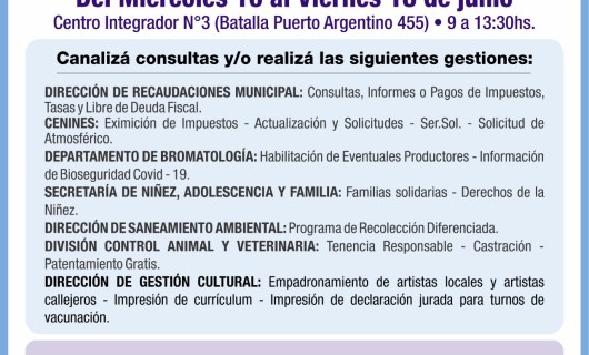 Rio Gallegos | Desde maana mircoles 16 hasta el viernes 19 del presente mes, en el horario de 9 a 13.30, el Centro Integrador Comunitario N 3 ubicado en Batalla Puerto Argentino 455, ser epicentro de una nueva jornada de El Estado en tu Barrio.