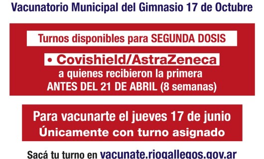 Rio Gallegos | El Vacunatorio Municipal realizar maana la aplicacin de segundas dosis para las vacunas Covishield/AstraZeneca slo a aquellas personas que hayan recibido la primera antes del 21 de abril y que cuenten con el turno correspondiente. Se recomienda revisar el carnet de vacunacin para constatar la informacin.