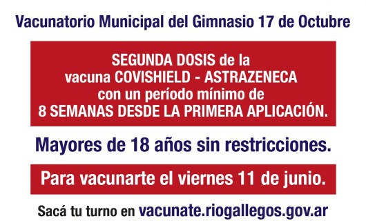 Rio Gallegos | Maana viernes ser el turno de aplicacin de segundas dosis para personas mayores de 18 aos con enfermedades crnicas y para mayores de 49 aos sin restricciones, que hayan recibido la primera dosis hace ms de 8 semanas y que se trate de las vacunas Covishield /Astrazeneca nicamente.