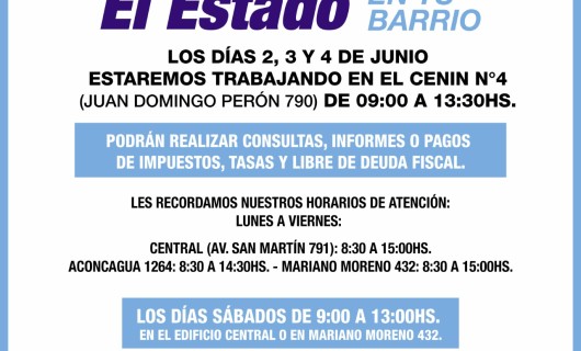 Rio Gallegos | Con el firme objetivo de seguir acercando a los vecinos soluciones y asesoramiento sobre el pago de impuestos y tasas municipales y de facilitar la accesibilidad a programas provinciales y nacionales, es que desde este mircoles y hasta el viernes se realizar una nueva instancia del Estado en tu Barrio, esta vez en el Cenin n4.