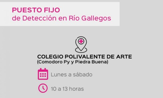 Rio Gallegos | El Gobierno de Santa Cruz informa que a partir de maana 14 de abril comenzar se habilitar el Puesto de Deteccin Comunitaria en el Centro Polivalente de Arte, ubicado en la interseccin de las calles Comodoro Py y Piedra Buena en la ciudad de Ro Gallegos. El mismo funcionar de lunes a sbado de 10 a 13 horas.