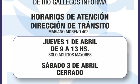 Rio Gallegos | La Municipalidad de Ro Gallegos informa los horarios de atencin dispuestos en Semana Santa en diversas dependencias. En este marco comunica que el viernes 2 de abril no habr recoleccin de residuos domiciliarios.