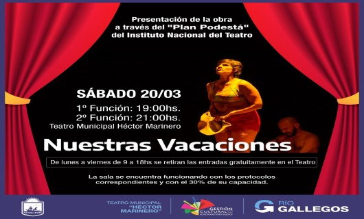 Rio Gallegos | Con entradas agotadas, este fin de semana se presentan dos obras en el teatro municipal Hctor Marinero, ubicado en San Martn 835. Se trata de elencos locales que en el marco del Plan Podest, un programa nacional de incentivo al teatro independiente, ponen en escena historias de drama y comedia para el pblico local.