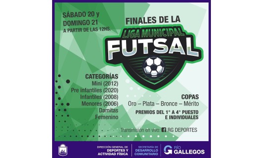 Rio Gallegos | Maana desde el medioda, y hasta el domingo a la tarde, se jugarn las finales pendientes del 2019 de la Liga Municipal de Ftbol de Saln (FUTSAL). Habr entrega de premios y reconocimientos. Toda la actividad se har sin pblico y podr ser seguida a travs de redes sociales.