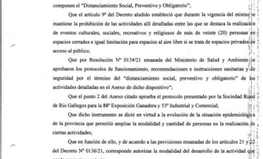 Rio Gallegos | El Gobierno de Santa Cruz a travs de la Jefatura de Gabinete de Ministro, informa que mediante la Resolucin Ministerial N 0134/21 emanada del Ministerio de Salud y Ambiente, se autoriz en el mbito de la ciudad de Ro Gallegos, la realizacin de la 88 Exposicin Ganadera y 53 Industrial y Comercial que se llevar a cabo del 25 al 28 de febrero, en la sociedad Rural de Ro Gallegos.
