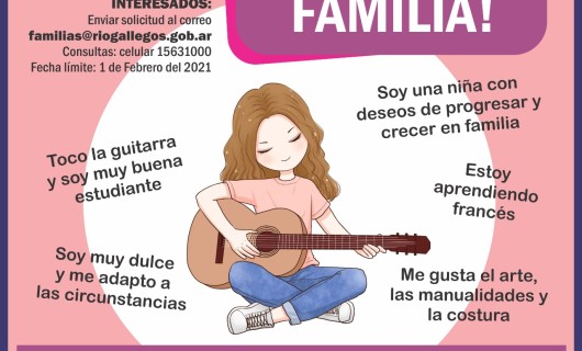 Rio Gallegos | Mediante una Convocatoria Pblica Provincial, la Municipalidad de Ro Gallegos busca una familia solidaria que desee incorporar a una nia de 12 aos, que actualmente se encuentra bajo el cuidado de la Secretara de Niez, Adolescencia y Familia.