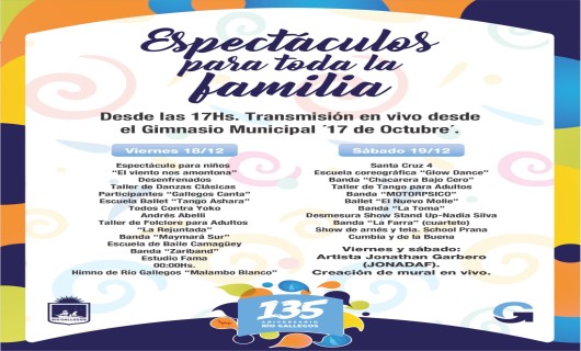 Rio Gallegos | La Municipalidad de Ro Gallegos invita a disfrutar, a travs de redes sociales, de los distintos espectculos que formarn parte de la conmemoracin del 135 Aniversario de la ciudad. Danzas, solistas, stand up, acrobacias, folclore, cumbia, rock, la oferta es variadsima y para todos los gustos.