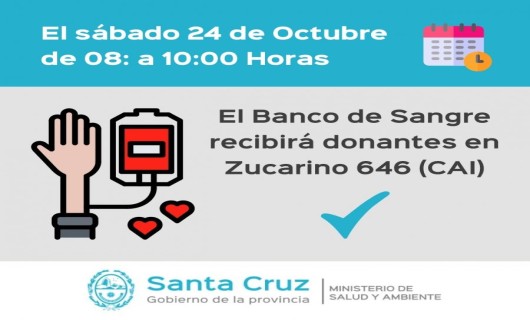 Rio Gallegos | El Centro Regional de Hemoterapia Ro Gallegos convoca a la comunidad a ser donantes voluntarios de sangre. Este sbado 24 de Octubre recibirn de 8 a 10 hs. a aquellas personas que quieran ser donantes voluntarios en el Centro de Atencin Infantil (CAI), ubicado en el Pasaje Zucarino N 646.