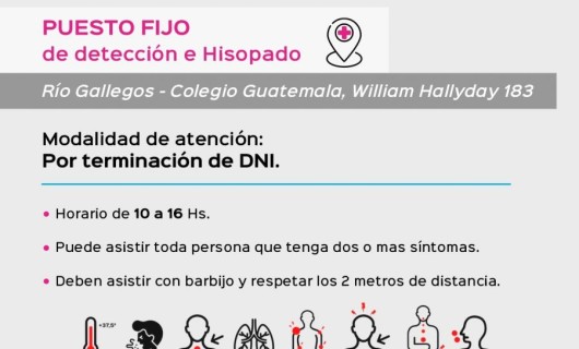 Rio Gallegos | El Gobierno de Santa Cruz, a travs del Ministerio de Salud y Ambiente, informa que los Puestos Fijos de deteccin e hisopado, ubicados en el Colegio Guatemala y Centro Administrativo San Benito, continan realizando diariamente los testeos a personas con dos o ms sntomas de COVID 19. La modalidad de atencin en ambos lugares es de acuerdo a la terminacin del DNI y el horario es de 10:00 a 16:00.