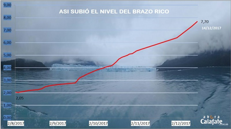 El agua de deshielo y lluvias sigue acumulándose en el brazo ya que en agosto el Glaciar Moreno obstruye el paso. Ya es la tercera mayor crecida en lo que va del siglo, aunque en datos comparativos se encamina a superar la de 2016, siempre y cuando el dique de hielo aguante. Mirá cómo evolucionó el nivel del Brazo Rico.
