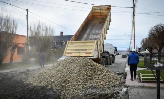 Rio Gallegos | Operadores y maquinaria de la Municipalidad de Ro Gallegos comenzaron esta tarde con las tareas de relleno en la calle Rawson, que haba sido intervenida para solucionar una prdida de agua de larga data. Una vez asentado el material, se continuar con la reparacin de la calzada.