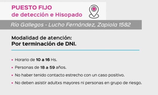 Rio Gallegos | El Ministerio de Salud y Ambiente informa que desde maana martes 8 de septiembre comenzar a funcionar un nuevo Puesto Fijo de Deteccin e Hisopado en el Gimnasio Municipal Lucho Fernndez, ubicado en las calles Zapiola 1582 y Av. Ricardo Balvn en la ciudad de Ro Gallegos. Se atender de acuerdo a la terminacin par e impar del DNI.