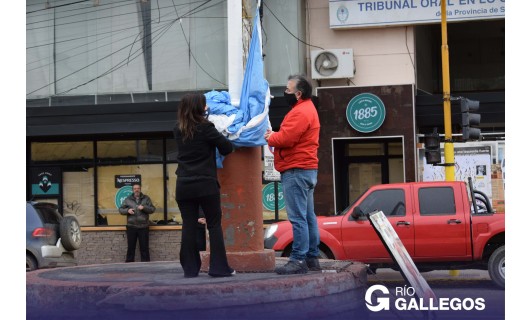 Rio Gallegos | Como ocurre cada domingo puntualmente a las 12, hoy se llev a cabo un nuevo Izamiento Dominical, el 35 del ao. Ante la situacin sanitaria actual, el izado de las banderas fue realizado nicamente por dos trabajadores municipales, a quienes acompaaron un grupo de vecinos y una lluvia fina y persistente.