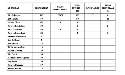 Rio Gallegos | El Ministerio de Salud y Ambiente informa que la provincia de Santa Cruz registra un total de 390 casos positivos a coronavirus, de los cuales 57 negativizaron al virus, 332 se encuentran activos en la provincia, un fallecido en Ro Gallegos. Dos (2) nuevos casos positivos se registraron en la localidad de Rio Gallegos desde el informe del Lunes 27 a las 19 horas.