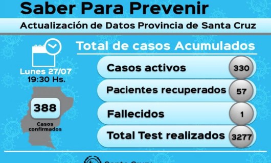 Rio Gallegos | El Ministerio de Salud y Ambiente informa que la provincia de Santa Cruz registra un total de 388 casos positivos a coronavirus, de los cuales 57 negativizaron al virus, 330 se encuentran activos en la provincia, un fallecido en Ro Gallegos. Doce (12) nuevos casos positivos se registraron en la localidad de Rio Gallegos desde el informe del Lunes 27 a las 12 horas.