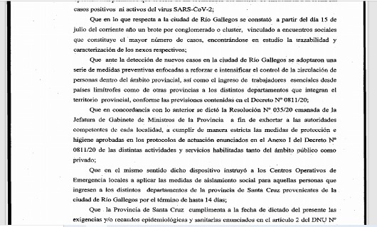 Rio Gallegos | A travs del mismo se adhiere al DNU N 605 del Gobierno Nacional y instruye a continuar con el monitoreo del brote epidemiolgico en la capital provincial. Tambin solicita a las autoridades comunales y/o Centros Operativos de Emergencia Locales intensificar el control sobre el cumplimiento de los protocolos de funcionamiento de las actividades y servicios habilitadas.