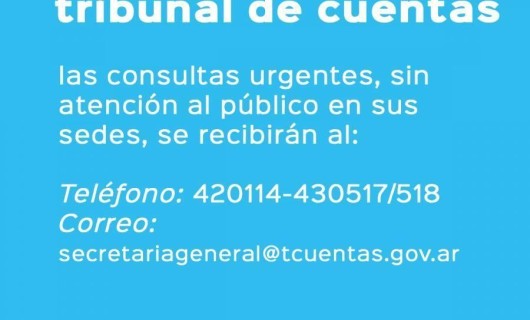 Rio Gallegos | Compartimos a continuacin el comunicado del Tribunal de Cuentas en el marco de la Pandemia vinculada al COVID-19. Se recuerda que el organismo tiene habilitada las lneas telefnicas 420114-430517/518 y una casilla de correo electrnico para consultas urgentes sin atencin al pblico en sus sedes. Comunicado completo