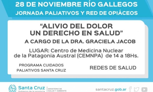 Rio Gallegos | El Gobierno de Santa Cruz a travs del Ministerio de Salud y Ambiente pondr en marcha este jueves 28 de noviembre el Programa de produccin pblica y distribucin gratuita de opioides para el alivio del dolor de los pacientes oncolgicos que se atienden en la provincia. La jornada se concretar de 14 a 18 hs. en el Centro de Medicina Nuclear Patagonia Austral (CENMPA).