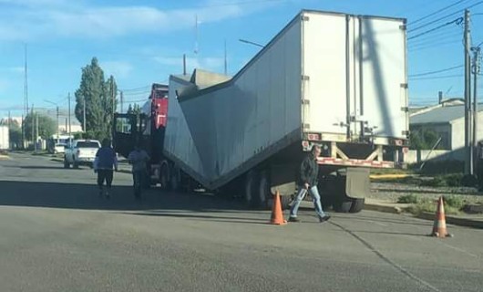 Rio Gallegos | Esta tarde sucedi un hecho inslito a causa del viento, segn dio cuenta fuentes policiales, el viento liber la funda de un camin con dominio chileno, destruyendo la caja de la unidad, a la altura de Neomat.