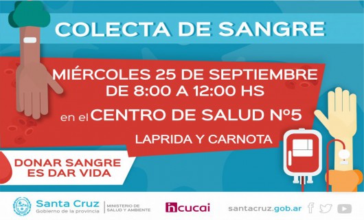 Rio Gallegos | El Gobierno provincial contina con la realizacin de colectas solidarias de sangre en distintos puntos de Ro Gallegos. Este mircoles estarn con una nueva jornada en el Centro de Salud N 5, ubicado en las calles Laprida y Carnota, de 08 a 12 horas.