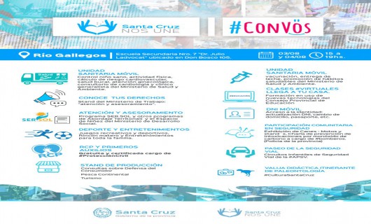 Rio Gallegos | Con la participacin de los diferentes organismos del Gobierno de Santa Cruz, se concretarn este fin de semana las jornadas interministeriales Santa Cruz Nos Une Con Vos, en el Colegio Secundario N 7 Dr. Julio Ladvocat, ubicada en Don Bosco 105 en la ciudad de Ro Gallegos. Las actividades se desarrollaran maana sbado 3 y el domingo 4 de agosto a partir de las 15:00.