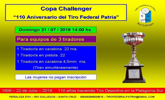 Rio Gallegos | El prximo domingo 21 a partir de las 14:00 Hs se disputara la edicin 2019 de la copa challenger "110 Aniversario del Tiro Federal Patria para equipos de tres tiradores/as , uno en pistola .22, otro en carabina .22 y un tercero en carabina de aire