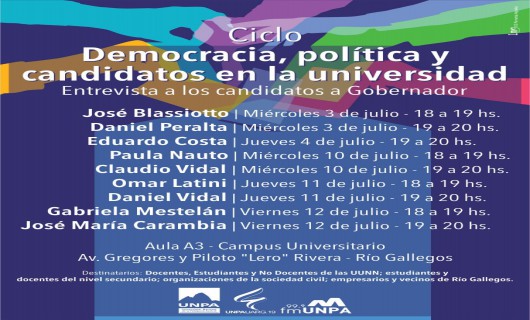 Rio Gallegos | A pocos das de las prximas elecciones provinciales y como parte del sano ejercicio de la democracia, la Unidad Acadmica Ro Gallegos de la UNPA, ofrece a toda la comunidad un ciclo de entrevistas con los candidatos y candidatas al cargo de Gobernador de la Provincia de Santa Cruz.