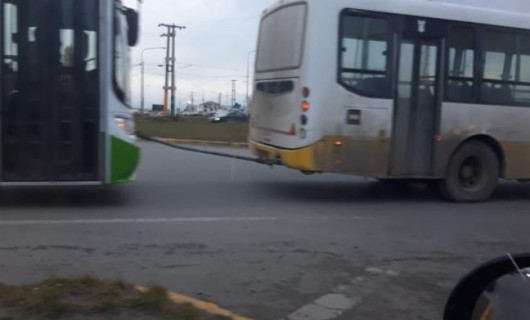 Rio Gallegos | La escena del colectivo con las caractersticas de la empresa de transporte anterior, arrastrando a una unidad de Maxia, resulta ms que irnico, bastante preocupante.