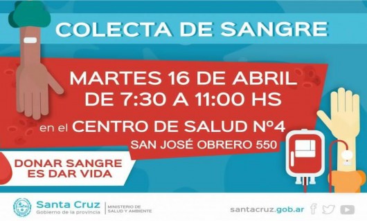Rio Gallegos | El Ministerio de Salud y Ambiente a travs del Centro Regional de Hemoterapia y el Centro de Salud N 4 de Ro Gallegos, llevar adelante hoy, una jornada de colecta de sangre de 7:30 a 11 horas. Adems las personas que participen se podrn registrar como potenciales donantes de mdula sea.