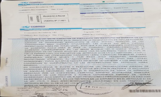 Rio Gallegos | Ante los sucesivos incumplimientos de la operadora, el Instituto de Energa de Santa Cruz la intim a readecuar las declaraciones juradas de inversiones correspondientes a 2019 bajo apercibimiento de caducidad de las reas.