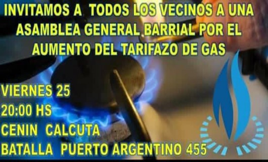 Rio Gallegos | La invitacin es para este viernes 25 de enero, a las 20 horas en el Cenin Madre Teresa de Calculta, sito en Batalla Puerto Argentino 455 de la ciudad de Ro Gallegos. La convocatoria surge ante la preocupacin por el tarifazo impulsado por Camuzzi.
