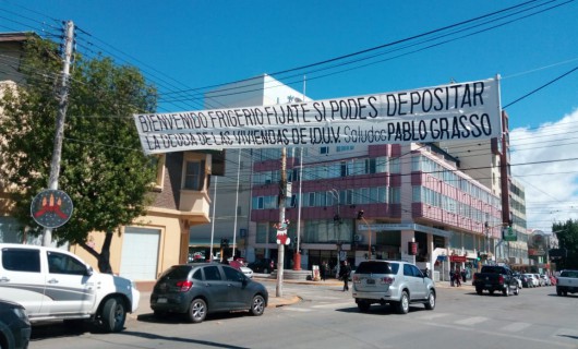 Rio Gallegos | "Bienvenido Frigerio,fijate si pods depositar la deuda de las viviendas de IDUV. Saludos Pablo Grasso", rezan las pancartas colocadas en el avenida principal de esta capital, a la espera de la llegada de Rogelio Frigerio.