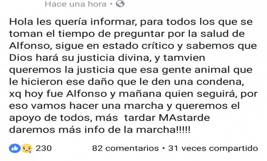 Rio Gallegos | A travs de las redes sociales los vecinos se organizan para realizar una marcha para pedir Justicia por Alfonso, el joven que fue atacado sexualmente por tres sujetos.