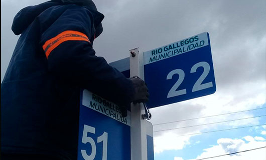 Rio Gallegos | En la jornada de ayer personal de la divisin sealizacin dependiente de la Secretaria de Obras Pblicas y Urbanismo olocaron nomencladores y cartelera vial en distintos puntos de la ciudad.