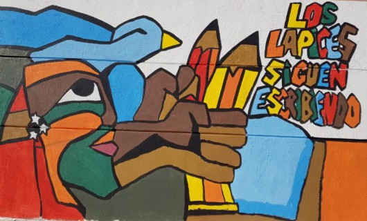 Rio Gallegos | Los lpices siguen escribiendo, dice el mural pintado en el Complejo Cultural Santa Cruz por estudiantes de colegios secundarios de Ro Gallegos y bajo la supervisin del dibujante Andrs Vern.