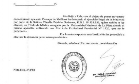 Rio Gallegos | La primera alerta fue a raz de una nota enviada por el Colegio Mdico al presidente del Colegio de Farmaceuticos. Seala que la mujer denunciada utiliza una matrcula que no le pertenece.