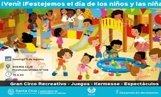Rio Gallegos | La cartera social, a travs de la Subsecretara de Abordaje Territorial, se encuentra organizando la propuesta para festejar del Da del Nio y Nia en el Atltico Boxing Club. La actividad es libre y gratuita y ser este domingo 5 de agosto a partir de las 16 horas