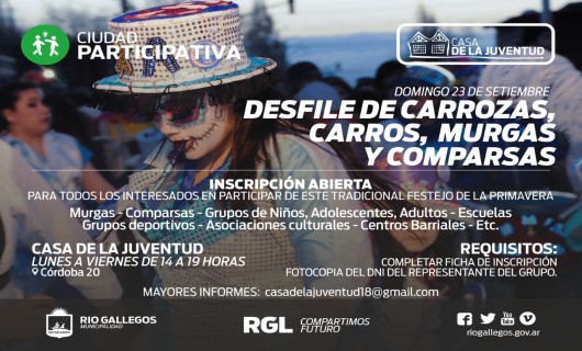 Rio Gallegos | As lo inform Carla Beroiz, a cargo del Departamento de Juventud de la Municipalidad de Ro Gallegos, quien a partir de la fecha abri la convocatoria para la inscripcin al Desfile 2018, que se realizar el domingo 23 de septiembre.
