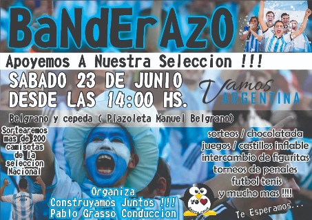 Rio Gallegos | La fiebre mundialista encontrar este sbado en Belgrano y Cepeda un Banderazo con juegos para nios, torneo de penales y ftbol tenis y sorteos de 200 camisetas de argentina. Organiza el espacio poltico Construyamos Juntos.