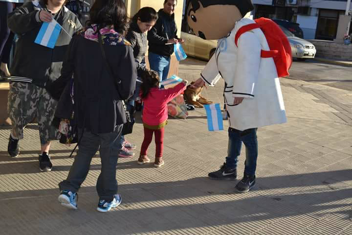 Rio Gallegos | Mediante una iniciativa de la Agrupacin Fuerza Propia, ayer y hoy entregaron banderas y escarapelas a los vecinos, sobre todo a los ms chicos por el particular personaje de Zamba, por motivo de conmemorarse la semana patritica de Mayo.