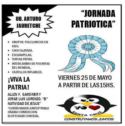 Rio Gallegos | El viernes 25 de mayo a partir de las 15:00 en las calles Allen Gardiner y Jos Lorenzo del barrio Natividad habr grupos folclricos en vivo, juegos para chicos, intercambio de figuritas del mundial y merienda para disfrutar en familia.