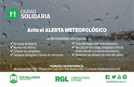 Rio Gallegos | A raz del alerta Meteorolgico emitido por el Servicio Nacional de Meteorologa sobre abundantes precipitaciones para la ciudad de Ro Gallegos, todas las reas operativas y de asistenciadependientes de la Secretaria de Estado de Seguridad del Ministerio de Gobierno, recorrieron las diferentes zonas afectadas para asistir a los vecinos.