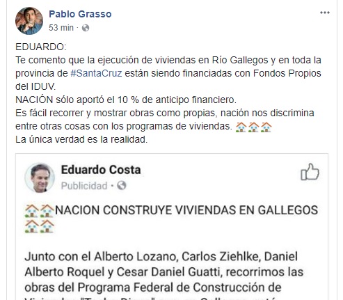Rio Gallegos | Tras los dichos del legislador sobre las viviendas en Santa Cruz, Pablo Grasso le record que Nacin solo desembolso el 10% de adelanto financiero y las obras continan en ejecucin con fondos propios de IDUV.