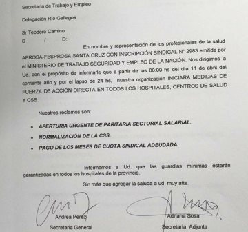 Rio Gallegos | El gremio de APROSA inform que a partir de las 00:00 horas del da mircoles, y por un lapso de 24 horas, en reclamo a la apertura de paritaria, normalizacin de la CSS y por el pago de los meses de cuota sindical.