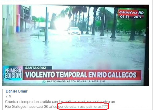Rio Gallegos | El "Canal N 1 de las Noticias Argentinas", confundi a la capital de Santa Cruz con otra ciudad, en la que en se observan "Palmeras" en su Boulevard, cosa que no es cierta, ya que la capital no posee ninguna de estos arboles tropicales en calles con estos elementos urbanos. Sucedi luego del rpido eco que logr el temporal que azot a Ro Gallegos ayer.