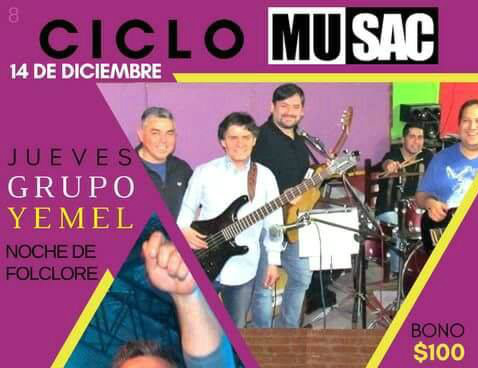 Rio Gallegos | Este prximo jueves 14 de diciembre a las 22:00 en el Saln Auditorio Luis Villarreal del Complejo Cultural Santa Cruz, se llevar a cabo una nueva velada folklrica con la participacin del grupo YEMEL.