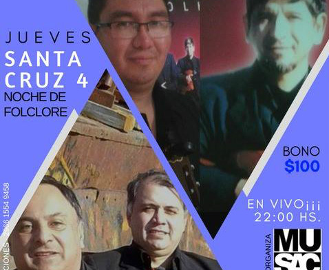Rio Gallegos | Sigue el Ciclo MUSAC, este prximo jueves 7 de diciembre a las 22:00, en el Saln Auditorio del Complejo Cultural. Los artistas del mbito folklrico Santa Cruz 4, repasarn su repertorio y el costo de la entrada ser un bono contribucin de cien pesos.